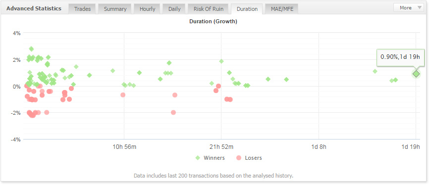 Рассмотрение графика сделок в координатах «результат в пунктах/время» позволяет выявить интересную деталь (которая, конечно, заметна и при анализе сделок на графиках): заметная часть сделок закрывается по стопу размером 75, либо 85 пунктов. По-видимому, в отличие от импульсной системы, где подстройка под волатильность импульса обеспечивает улучшение результата, подобная подстройка при торговле в расчете на откат на фунте не имеет большого смысла. Это подтверждается логикой торговли и других известных мне «откатных» управляющих с длительной успешной историей — как правило, они используют какой-то фиксированный размер стопа в комбинации с трейлингом.
