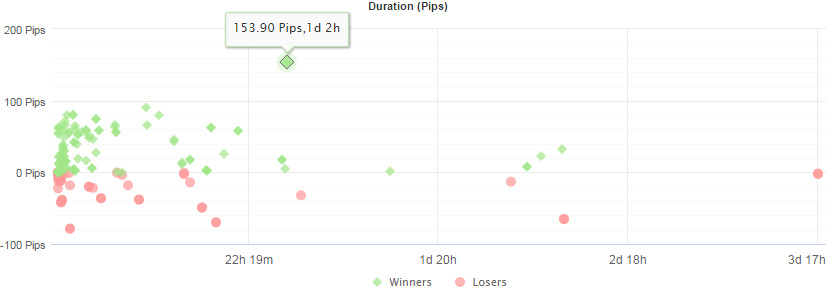 График Duration показывает, что большинство торговых позиций закрывается в течение первых нескольких часов после открытия. Изредка позиции могут оставляться на длительное время, причем это является оправданным: самая прибыльная сделка (отмеченная на скриншоте выше) длилась более суток.