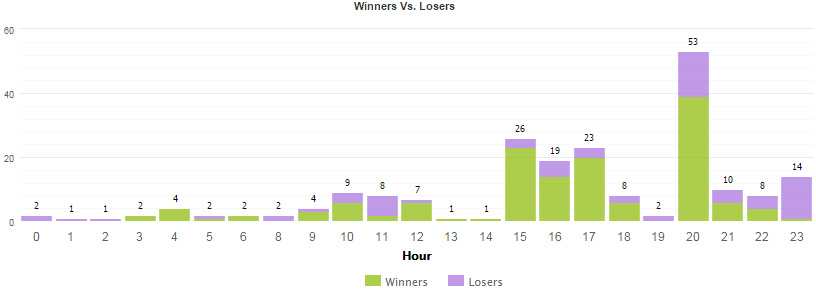 Почасовой график открытия позиций наглядно показывает, что большинство прорывов происходит во время Европейской и Американской торговых сессий, в периоды выхода новостей и наибольшей волатильности на финансовых рынках.