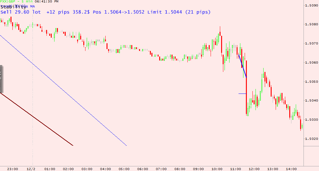 Внутридневная сделка в sell, открытая во время весьма хаотичной «болтанки» на фунте. По-видимому, открыта в расчете на откат от снижающейся трендовой линии (показана на скрине черным).