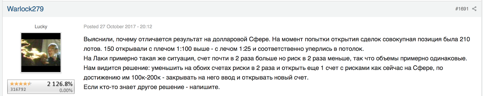 В итоге было принято решение об открытии «клонов» как основного счёта Lucky Pound, так и более высокорискового аналога Sphere для их разгрузки. При этом, конечно, потенциал разгрузки будет ограниченным, поскольку основная масса инвесторов пришла в счёт Lucky Pound из рейтинга и совершенно не в курсе наличия каких-то там клонов.