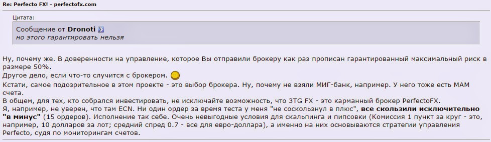 Заметно, что торговля ведётся по самым волатильным парам – чаще всего по евро/доллар и фунт/доллар. При этом ведётся преимущественно днём, когда волатильность рынка наибольшая и можно за короткий промежуток времени получить заметную прибыль. Используется преимущественно скальпинг, а значит, торговля в большой степени автоматизирована. Этим можно объяснить наличие в каждой команде трейдеров по десятку программистов (как указано на сайте Perfecto). Но самое главное, что управляющими не используются такие рискованные стратегии, как усреднение/мартингейл и пересиживание сделок. Почти все сделки закрываются внутри дня, что исключает возможность моментального слива счёта и сводит торговые риски к минимуму. В частности, можно сказать с уверенностью, что торговые риски здесь значительно меньше, чем у управляющих известного иностранного хедж-фонда Haeres.