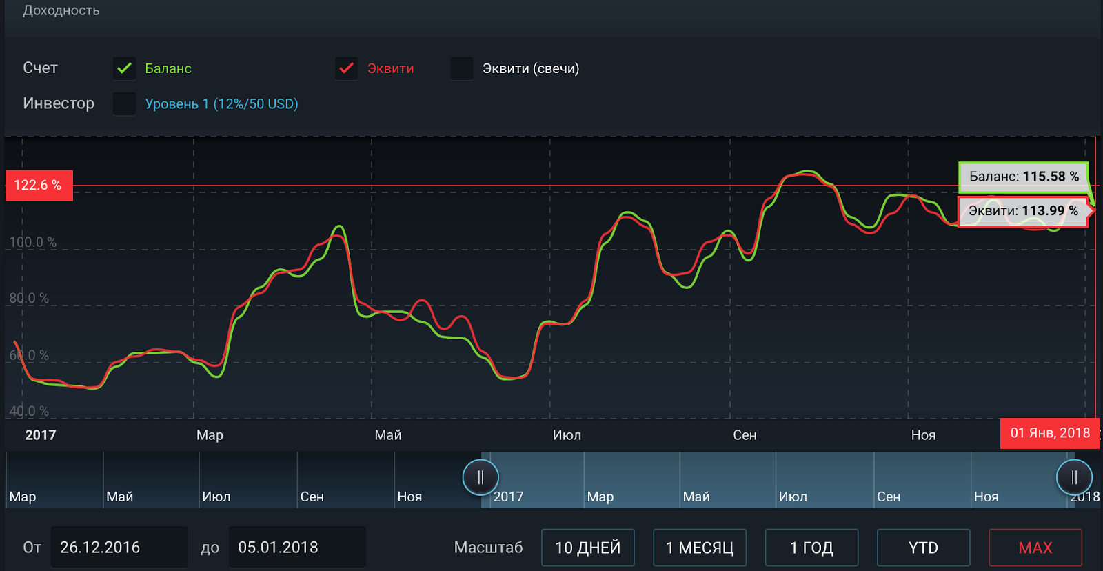 Основной принцип, которого буду придерживаться в ближайшем будущем — включать в портфель не просто управляющих, в чьих будущих положительных результатах присутствует уверенность, но и только тех из них, кто способен показать хороший итоговый результат на высоких рисках. Всё-таки в конце концов любого инвестора интересуют не то, каким процентом он рискнул и какой заработал, а общий итоговый результат. Поэтому и долю портфеля в Альпари, которая до сих пор была достаточно консервативной, я планирую переделать, включив в неё лишь счета с высокими торговыми рисками. Что из этого выйдет, покажет следующий год.