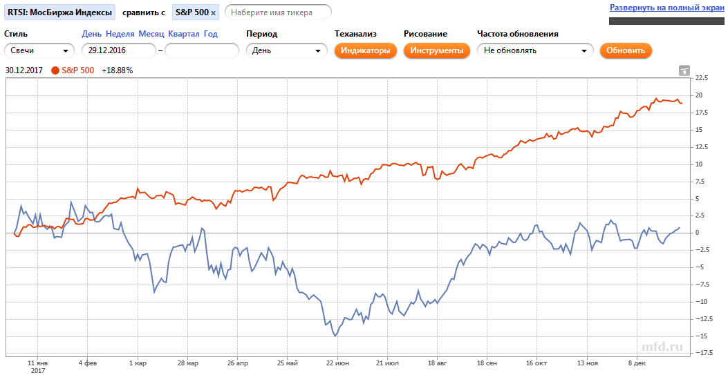 А фондовый рынок РФ болтался в этом году возле нуля. Впрочем, учитывая рост РТС за год до этого на ~50%, это полностью нормальная динамика. На скриншоте представлено сравнение процентной доходности S&P и РТС, оба (что важно) номинированы в долларах.