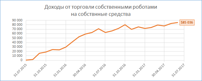 В итоге с конца лета 2015 года и по момент написания этой статьи (начало лета 2017 года) основной заработок мне приносила именно торговля собственного советника на мои собственные деньги. За указанный период времени доход составил около 85 000 долларов США, деньги, конечно, не так чтобы очень большие, но хорошо, что это не единственный мой источник заработка ))).