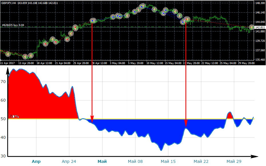 Поясню сразу, что изображено на графиках. Красными стрелками показаны моменты, в которых управляющий сменил направление открываемых сделок на противоположное — с buy на sell и наоборот. Черными горизонтальными линиями показано, при достижении какого «перевеса толпы» заключаются сделки. Из этого примера видно, что это значение невелико и составляет в данном случае не более 5%.