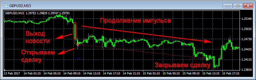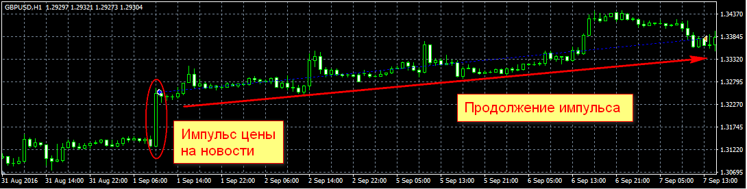 Итак, Lucky Pound работает при помощи импульсной АТС собственного написания. Для тех читателей, которые не знакомы с тем, что это означает, поясняю. Торговля ведется роботом (экспертом, советником), основная идея которого звучит как: «вероятность продолжения в направлении недавнего сильного импульса больше, чем вероятность отката». Как правило, подобные импульсы случаются на новостях (хотя и не всегда, но в большинстве случаев). Поэтому торговля обычно идет уже после новостей, спровоцировавших сильное движение (обычно с задержкой в 5-30 минут после новости). Вот как это выглядит на графиках: