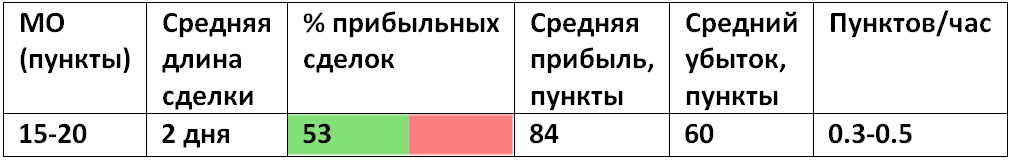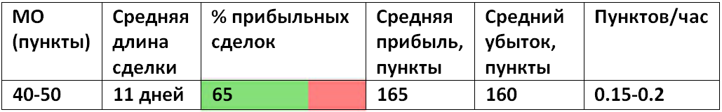 Как видно из статистики, система оптимизирована на количество прибыльных сделок порядка 65%. Дело в том, что подобные импульсные системы можно настраивать по-разному: можно брать процентом прибыльных сделок, можно настроить на 50%, но, поскольку средняя прибыль при этом будет заметно больше среднего убытка, общий результат окажется не хуже, некоторые вообще настраивают на ~30% прибыльных сделок, вылавливая лишь самые крупные тренды (которые бывают не так уж часто – в этом минус подобных систем).