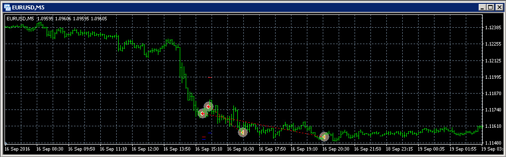 В данном случае первая сделка закрылась сразу с небольшой прибылью (что оказалось своевременным решением — сразу после фиксации прибыли образовался небольшой разворот тренда), а вторая «дожала тренд до конца», получив в итоге большую прибыль.