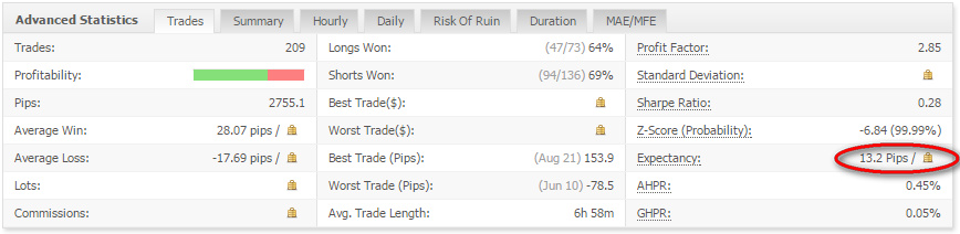 В первую очередь в глаза бросается прямо-таки невероятное отношение максимальной прибыли к максимальному убытку за день: оно превышает 4! Очень редко можно встретить какую-либо торговую стратегию, при использовании которой трейдер в лучший день может получить в 4 раза больше, чем потерять в наихудший. Такой показатель вообще уникален для Форекса, и показывает в первую очередь «дружелюбность» используемой торговой стратегии к психологии инвестора: небольшие, контролируемые убытки и большие редкие прибыли, а не наоборот.