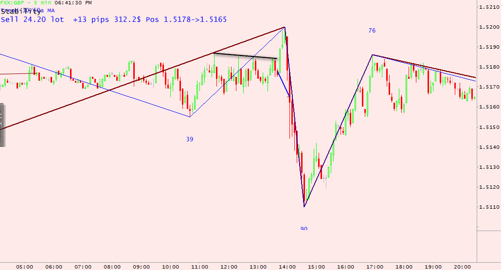 1. Импульсная торговля, как сразу после сильных новостных импульсов, так и через некоторое время после импульса на откате. Из ближайших аналогов первого — Lucky Pound, Brava Fund. Второй метод также используется некоторыми трейдерами, наиболее популярным с такой логикой входов был в свое время робот WallStreet (однако в нем основной упор был сделан на число прибыльных сделок, с малым соотношением средней прибыли к убытку). Схожая схема торговли применялась также и avp555 в Альпари, однако он торговал только золотом. Еще несколько знакомых мне трейдеров, не представленных в сфере ПАММ/MAM также пользуются схожей методикой, особенно на паре GBPUSD. При анализе Stability учитывает, судя по всему, наличие близких экстремумов и хорошо заметных наклонных линий поддержки/сопротивления.