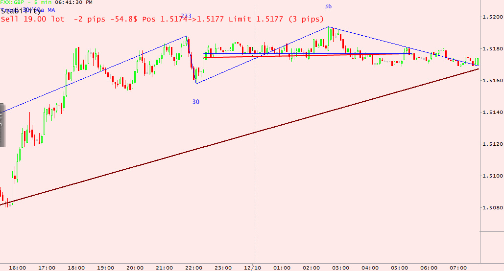 Внутридневная сделка в sell, открытая во время весьма хаотичной «болтанки» на фунте. По-видимому, открыта в расчете на откат от снижающейся трендовой линии (показана на скрине черным).