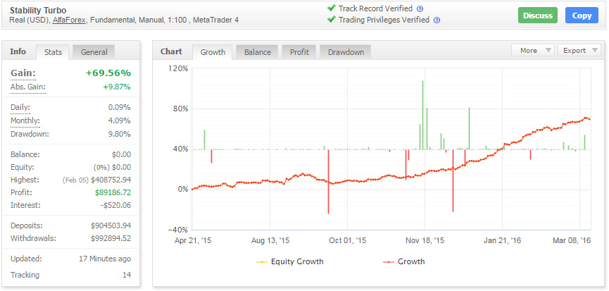 Высокорисковый публичный счет Stability DualTurbo существует несколько меньше, и имеет в 2 раза более низкие риски по сравнению с предыдущим непубличным вариантом. Судя по декларации, трейдер ожидает здесь максимальную просадку в размере 30%, так что этот вариант может подойти для консервативных инвесторов. Оферта здесь тоже 35%. У счета есть также рублевый аналог.