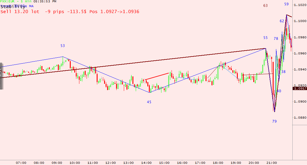 В случае со Stability первая проблема состоит в сути используемых систем. Поскольку тип торговли относится к внутридневной с небольшим ожиданием со сделки и маленькой средней длиной (большинство сделок закрывается в течение получаса), анализ торговли весьма непрост. Ниже приведу примеры сделок со своими комментариями. В большинстве случаев опущены совсем короткие сделки длиной до 15 минут, т.к. проанализировать их весьма проблематично. Хотя они есть, и их немало. Здесь и далее синим обозначены линии, соединяющие вход и выход в прибыльных сделках, красным — в убыточных.