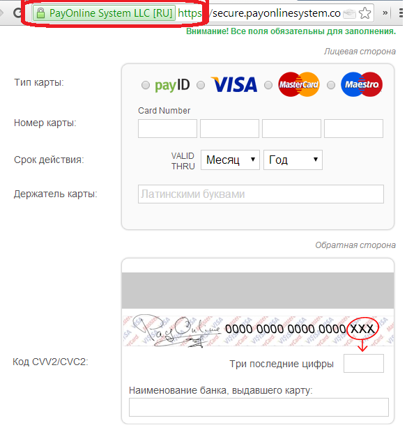 - при заполнении данных в платежном шлюзе вы должны удостовериться, что используется защитный протокол https и рядом с адресной строкой информация о сайте подсвечивалась зеленым, а не красным.