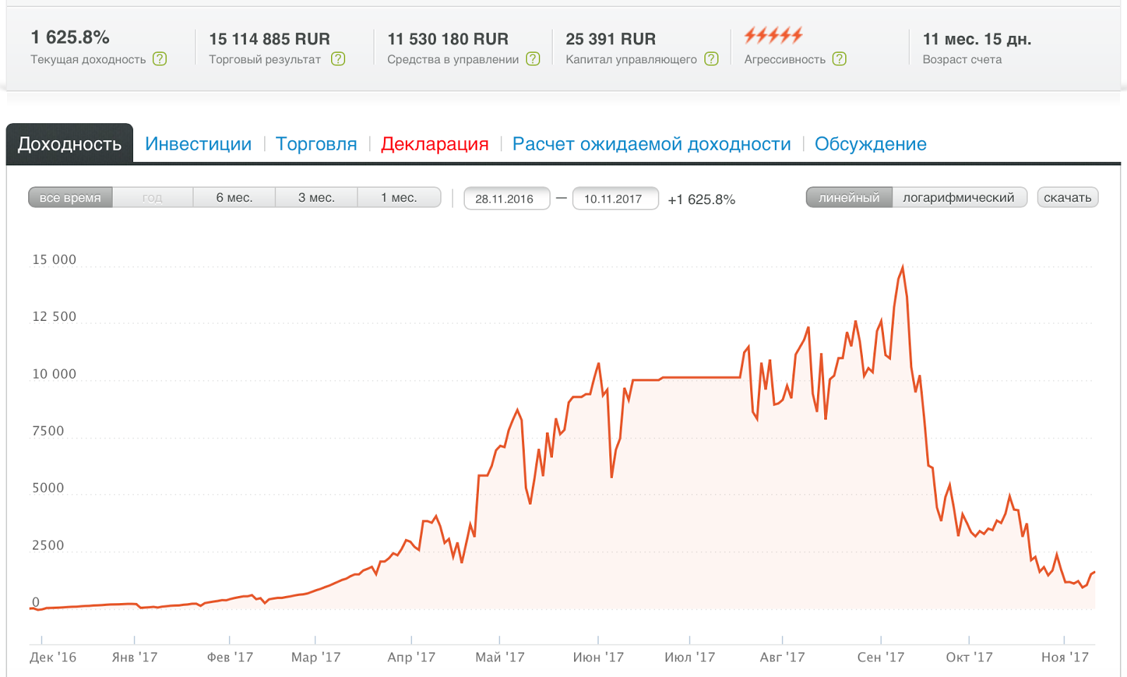 Тем не менее, общий торговый результат счёта всё же положителен, поскольку после первоначального взлёта и длительной стагнации счёта инвесторы проявили благоразумность и вывели средства. Во второй раз (при достижении планки в 15000%) инвесторам уже не так повезло, однако первоначальный вывод всё же оказался достаточно крупным, чтобы итоговая доходность счёта в рублях оказалась не только положительной, но и весьма немалой. По показателю «торговый результат» счёт оказался на 11 месте среди всех открытых ПАММ-счетов сервиса: