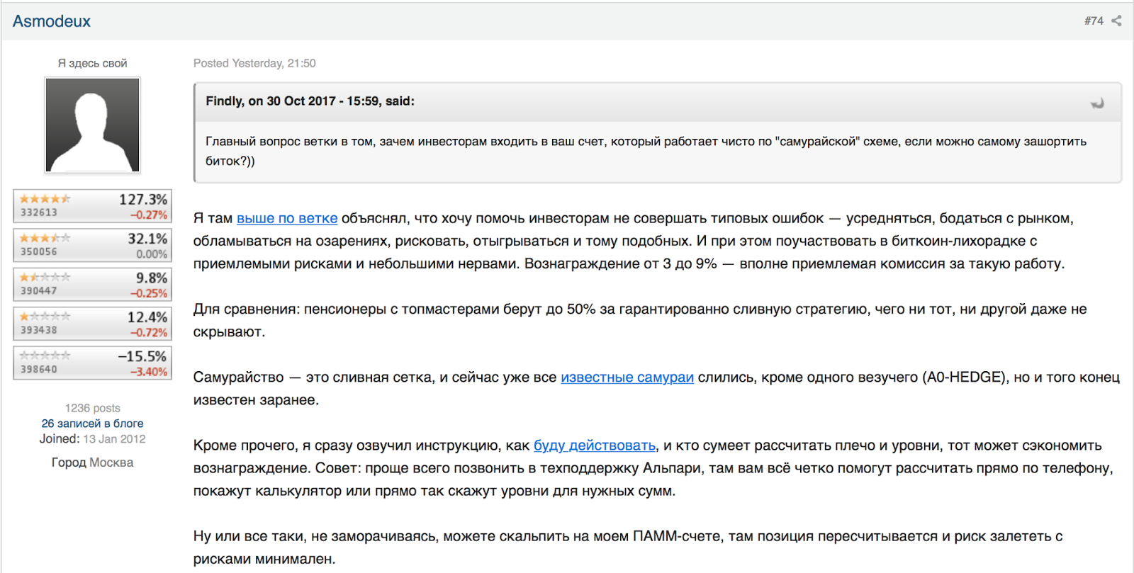 В пылу перебранки с инвесторами Asmodeux прокомментировал торговлю управляющих с похожей на слившегося не так давно Samurayi логикой: наличие постоянно открытых среднесрочных позиций с явным ростом используемого плеча в просадке.