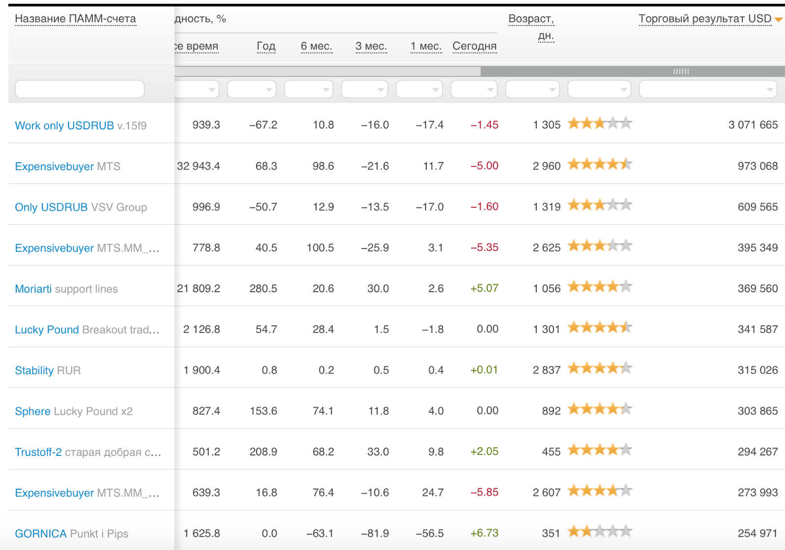 Lucky Pound (один из лучших трейдеров площадки) тут отсутствует, перспективы Stability туманны, а во все остальные счета лично я не вложил бы ни цента. Наверняка большинство инвесторов эти средства потеряет, что не способствует притоку средств на ПАММ-площадку.