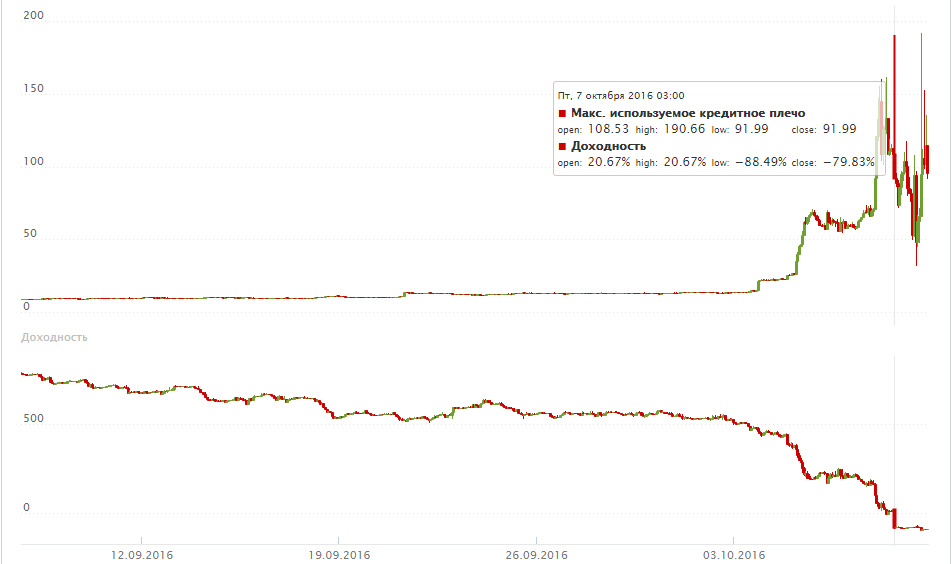 К сожалению, вывести портфель на «нормальный» уровень, чтобы каждый равноценный вариант инвестиций в нем вносил в среднем равный вклад в общую доходность, пока так и не получается. Форс-мажор по фунту лишний раз доказывает, что составлять портфель логичнее из счетов, подобных F-Crash Test, ведь при «попадании» на нечто подобное инвестор с низкими рисками, ограниченными стопами, может получить убыток, многократно превышающий размер стопа, а при торговле по Optimal F убыток жестко ограничен размером депозита трейдера/инвестора. Однако другие управляющие не торопятся открывать высокорисковые счета, поэтому пока что на общую доходность портфеля счета Solandr’а оказывают большее влияние, чем какие-либо другие.