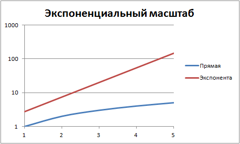 Делается это путем перемены масштаба, как правило, одной из осей координат (обычно вертикальной — оси ординат). Если на обычных графиках шкала изменяется линейно (1, 2, 3, … 10), то на логарифмических графиках шкала изменяется экспоненциально (1, 10, 100, … 10000000000). В результате очень быстро растущая кривая экспоненциальной зависимости, выглядящая на графиках с линейным масштабом уходящей быстро вверх кривой, на графике в логарифмическом масштабе имеет вид прямой: