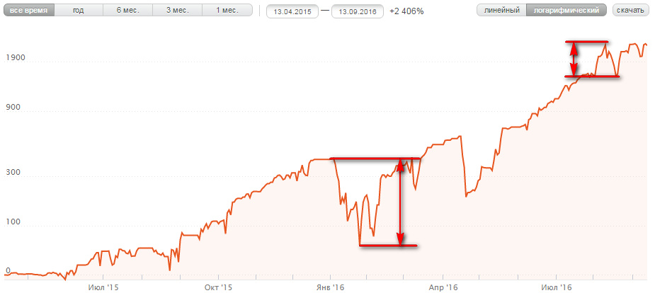 Такой особенностью графиков в линейном масштабе отчасти объясняется массовое «бегство» инвесторов из счета, когда просадка едва ли достигает даже половины своей максимальной исторической величины. Люди зачастую просто не понимают, что такая просадка уже была ранее, и не раз, и их очень пугает такое резкое снижение на графике.
