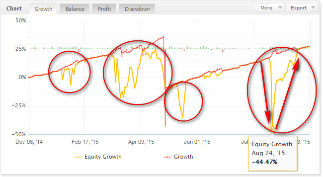 Относительно «плавный» уход в просадку по эквити (т.е. желтая линия эквити уходит от красной линии баланса не «резко», а постепенно), достаточно длительные периоды плавающих просадок (т.е. когда линия эквити находится ниже линии баланса). Просадка при этом показывается обычно более-менее корректно, поскольку одновременно с висящим убытком открываются/закрываются и другие сделки, а мониторинг myfxbook обновляет информацию обычно по закрытии сделок.