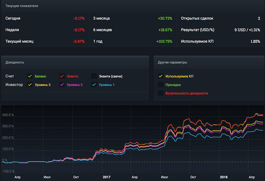 Аналогично счёту HibRuMix, торговля будет остановлена при достижении просадки в 50% от максимума. Разумеется, при наличии в портфеле исключительно «нетоксичных» систем такая просадка не может быть моментальной, и если когда-либо и случится, то только в случае длительной стагнации и убытков сразу множества входящих в портфель систем, чего никогда не случалось на истории.